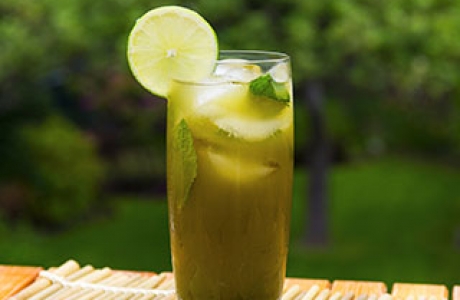 Agitar juntos el agua y matcha hasta que no queden grumos. Agregar el hielo , un chorrito de limón , puñados de menta y agite un poco más. (Agrega edulcorante si se quiere) . Vierta en vasos con rodajas de limón y menta adicionales.